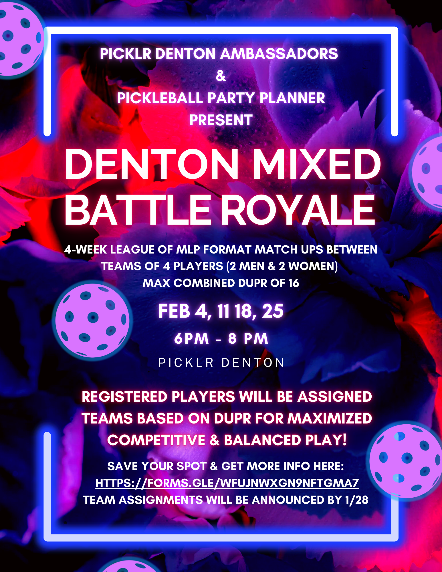 Join us for the first ever Denton Mixed Battle Royale Pickleball League! The lovely lady ambassadors of the Picklr Denton and Pickleball Party Planner have organized a 4-week league of the popular and exciting MLP format match ups! Read on to learn more about this awesome league and how to participate!